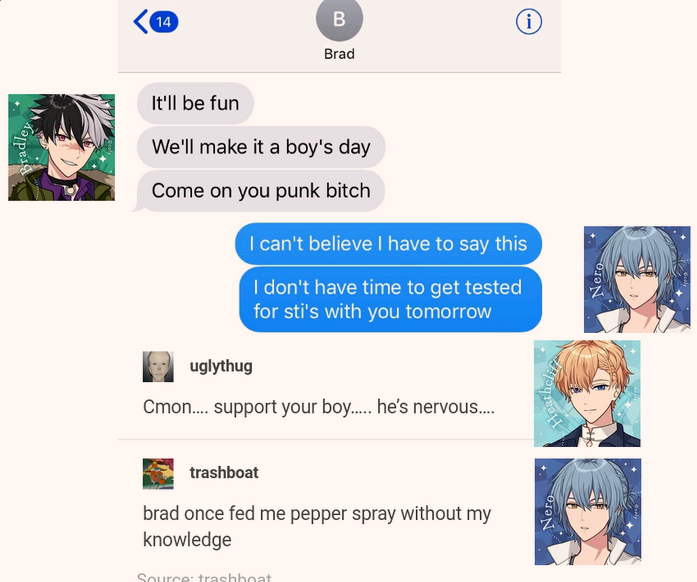 You start saying something and he cuts you off, sharp, familiar grin on his features. He reaches out, gently takes your chin in his hand and lightly shakes you by it. It's embarrassing, but you don't pull away.